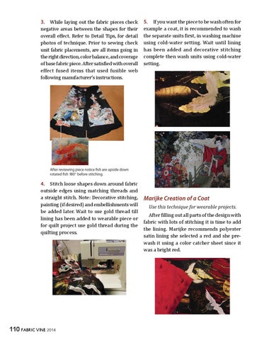 Marijke Creation of a Coat Use this technique for wearable projects. After filling out all parts of the design with fabric with lots of stitching it is time to add the lining. Marijke recommends polyester satin lining she selected a red and she prewash it using a color catcher sheet since it was a bright red.