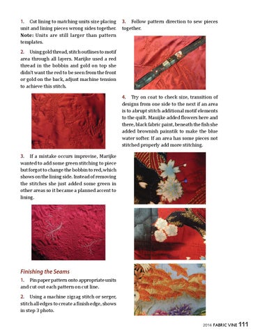 4. Try on coat to check size, transition of designs from one side to the next if an area is to abrupt stitch additional motif elements to the quilt. Mauijke added flowers here and there, black fabric paint, beneath the fish she added brownish painstik to make the blue water softer. If an area has some pieces not stitched properly add more stitching.