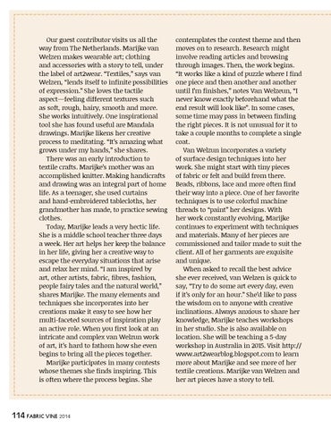 contemplates the contest theme and then moves on to research. Research might involve reading articles and browsing through images. Then, the work begins. “It works like a kind of puzzle where I find one piece and then another and another until I’m finishes,” notes Van Welzeun, “I never know exactly beforehand what the end result will look like”. In some cases, some time may pass in between finding the right pieces. It is not unusual for it to take a couple months to complete a single coat. Van Welzun incorporates a variety of surface design techniques into her work. She might start with tiny pieces of fabric or felt and build from there. Beads, ribbons, lace and more often find their way into a piece. One of her favorite techniques is to use colorful machine threads to “paint” her designs. With her work constantly evolving, Marijke continues to experiment with techniques and materials. Many of her pieces are commissioned and tailor made to suit the client. All of her garments are exquisite and unique. When asked to recall the best advice she ever received, van Welzen is quick to say, “Try to do some art every day, even if it’s only for an hour.” She’d like to pass the wisdom on to anyone with creative inclinations. Always anxious to share her knowledge, Marijke teaches workshops in her studio. She is also available on location. She will be teaching a 5-day workshop in Australia in 2015. Visit http:// www.art2wearblog.blogspot.com to learn more about Marijke and see more of her textile creations. Marijke van Welzen and her art pieces have a story to tell.