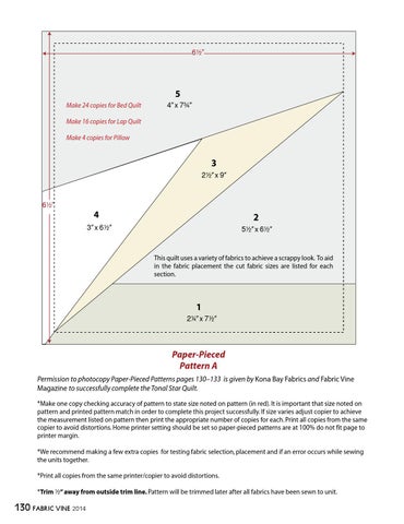 Paper-Pieced Pattern A Permission to photocopy Paper-Pieced Patterns pages 130–133 is given by Kona Bay Fabrics and Fabric Vine Magazine to successfully complete the Tonal Star Quilt. *Make one copy checking accuracy of pattern to state size noted on pattern (in red). It is important that size noted on pattern and printed pattern match in order to complete this project successfully. If size varies adjust copier to achieve the measurement listed on pattern then print the appropriate number of copies for each. Print all copies from the same copier to avoid distortions. Home printer setting should be set so paper-pieced patterns are at 100% do not fit page to printer margin. *We recommend making a few extra copies for testing fabric selection, placement and if an error occurs while sewing the units together. *Print all copies from the same printer/copier to avoid distortions. *Trim 2” away from outside trim line. Pattern will be trimmed later after all fabrics have been sewn to unit.