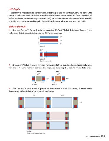 Let’s Begin Before you begin read all instructions. Referring to project Cutting Chart, cut First Cuts strips as indicated in chart then cut smaller pieces listed under Next Cuts from these strips. Refer to General Instructions (pages 146–147) for Accurate Seam Allowances and Assembly Line Method to construct this quilt. Use a 4”-wide seam allowance to sew this quilt.