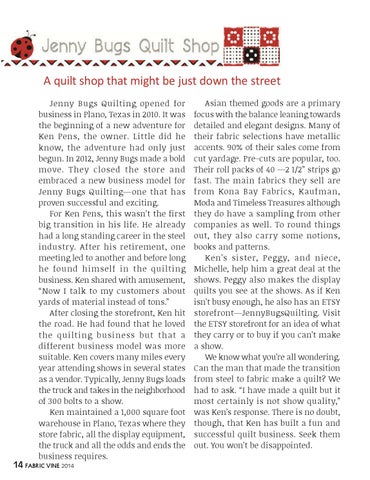 A quilt shop that might be just down the street Jenny Bugs Quilting opened for business in Plano, Texas in 2010. It was the beginning of a new adventure for Ken Pens, the owner. Little did he know, the adventure had only just begun. In 2012, Jenny Bugs made a bold move. They closed the store and embraced a new business model for Jenny Bugs Quilting—one that has proven successful and exciting. For Ken Pens, this wasn’t the first big transition in his life. He already had a long standing career in the steel industry. After his retirement, one meeting led to another and before long he found himself in the quilting business. Ken shared with amusement, “Now I talk to my customers about yards of material instead of tons.” After closing the storefront, Ken hit the road. He had found that he loved the quilting business but that a different business model was more suitable. Ken covers many miles every year attending shows in several states as a vendor. Typically, Jenny Bugs loads the truck and takes in the neighborhood of 300 bolts to a show. Ken maintained a 1,000 square foot warehouse in Plano, Texas where they store fabric, all the display equipment, the truck and all the odds and ends the business requires.