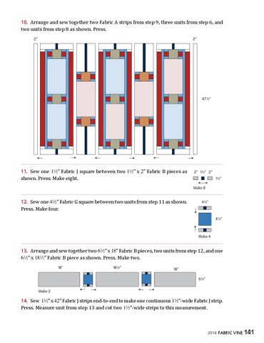 14. Sew !2” x $@” Fabric J strips end-to-end to make one continuous !2”-wide Fabric J strip. Press. Measure unit from step 13 and cut two !2”-wide strips to this measurement. 2014 fabric vine 141