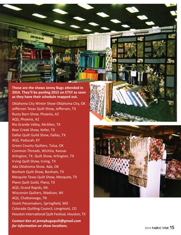 These are the shows Jenny Bugs attended in 2014. They’ll be posting 2015 on ETSY as soon as they have their schedule mapped out. Oklahoma City Winter Show-Oklahoma City, OK Jefferson Texas Quilt Show, Jefferson, TX Rusty Barn Show, Phoenix, AZ AQS, Phoenix, AZ Rio Grande Valley, McAllen, TX Bear Creek Show, Keller, TX Dallas Quilt Guild Show, Dallas, TX AQS, Paducah, KY Green County Quilters, Tulsa, OK Common Threads, Wichita, Kansas Arlington, TX. Quilt Show, Arlington, TX Irving Quilt Show, Irving, TX Ada Oklahoma Show. Ada, OK Bonham Quilt Show, Bonham, TX Mesquite Texas Quilt Show, Mesquite, TX Plano Quilt Guild, Plano, TX AQS, Grand Rapids, MI. Wisconsin Quilters, Madison, WI AQS, Chattanooga, TN Ozark Piecemakers, Springfield, MO Colorado Quilting Council, Longmont, CO Houston International Quilt Festival, Houston, TX Contact Ken at jennybugsquilt@gmail.com for information on show locations.