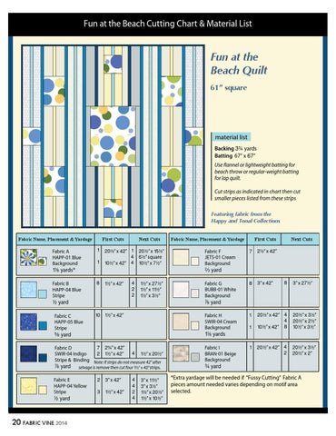 material list Backing #w yards Batting 67” x ^&” Use flannel or lightweight batting for beach throw or regular-weight batting for lap quilt. Cut strips as indicated in chart then cut smaller pieces listed from these strips Featuring fabric from the Happy and Tonal Collections First Cuts