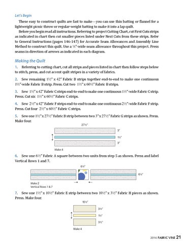 Let’s Begin These easy to construct quilts are fast to make—you can use thin batting or flannel for a lightweight picnic throw or regular-weight batting to make it into a lap quilt. Before you begin read all instructions. Referring to project Cutting Chart, cut First Cuts strips as indicated in chart then cut smaller pieces listed under Next Cuts from these strips. Refer to General Instructions (pages 146-147) for Accurate Seam Allowances and Assembly Line Method to construct this quilt. Use a 4”-wide seam allowance throughout this project. Press seams in direction of arrows as indicated in each diagram.