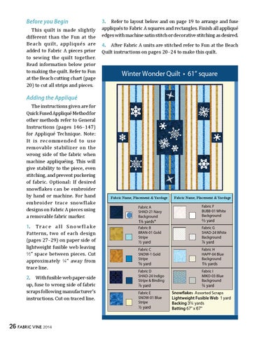 The instructions given are for Quick Fused Appliqué Method for other methods refer to General Instructions (pages 146–147) for Appliqué Technique. Note: It is recommended to use removable stabilizer on the wrong side of the fabric when machine appliquéing. This will give stability to the piece, even stitching, and prevent puckering of fabric. Optional: If desired snowflakes can be embroider by hand or machine. For hand embroider trace snowflake designs on Fabric A pieces using a removable fabric marker.