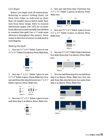 Let’s Begin Before you begin read all instructions. Referring to project Cutting Chart, cut First Cuts strips as indicated in chart then cut smaller pieces listed under Next Cuts from these strips. Refer to General Instructions (pages 146–147) for Accurate Seam Allowances and Assembly Line Method to construct this quilt. Use a 4”-wide seam allowance throughout this project. Press seams in direction of arrows as indicated in each diagram.
