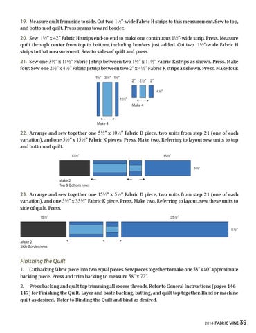 2. Press backing and quilt top trimming all excess threads. Refer to General Instructions (pages 146– 147) for Finishing the Quilt. Layer and baste backing, batting, and quilt top together. Hand or machine quilt as desired. Refer to Binding the Quilt and bind as desired. 2014 fabric vine 39