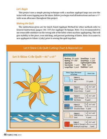 Let’s Begin This project uses a simple piecing technique with a machine appliqué large sun over the water with waves lapping near the shore. Before you begin read all instructions and use a 4”wide seam allowance throughout this project.