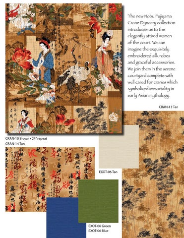 The new Nobu Fujiyama Crane Dynasty collection introduces us to the elegantly attired women of the court. We can imagine the exquisitely embroidered silk robes and graceful accessories. We join them in the serene courtyard complete with well cared for cranes which symbolized immortality in early Asian mythology. CRAN-13 Tan