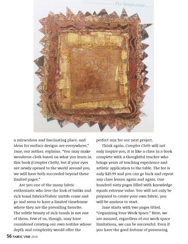 perfect mix for our next project. Think again. Complex Cloth will not only inspire you, it is like a class in a book complete with a thoughtful teacher who brings years of teaching experience and artistic application to the table. The fee is only $29.99 and you can go back and repeat any class lesson again and again. One hundred sixty pages filled with knowledge equals extreme value. You will not only be prepared to create your own fabric, you will be anxious to start. Jane starts with two pages titled, “Organizing Your Work Space.” Here, we are assured, regardless of our work space limitations, we can be successful. Even if you have the good fortune of possessing