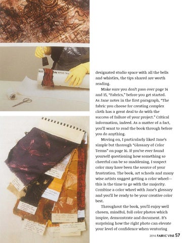 designated studio space with all the bells and whistles, the tips shared are worth reading. Make sure you don’t pass over page 14 and 15, “Fabrics,” before you get started. As Jane notes in the first paragraph, “The fabric you choose for creating complex cloth has a great deal to do with the success of failure of your project.” Critical information, indeed. As a matter of a fact, you’ll want to read the book through before you do anything. Moving on, I particularly liked Jane’s simple but thorough “Glossary of Color Terms” on page 16. If you’ve ever found yourself questioning how something so cheerful can be so maddening, I suspect color may have been the source of your frustration. The book, art schools and many wise artists suggest getting a color wheel— this is the time to go with the majority. Combine a color wheel with Jane’s glossary and you’ll be ready to be your creative color best. Throughout the book, you’ll enjoy well chosen, mindful, full color photos which inspire, demonstrate and document. It’s surprising how the right photo can elevate your level of confidence when venturing 2014 fabric vine 57