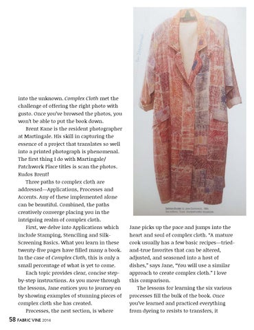 into the unknown. Complex Cloth met the challenge of offering the right photo with gusto. Once you’ve browsed the photos, you won’t be able to put the book down. Brent Kane is the resident photographer at Martingale. His skill in capturing the essence of a project that translates so well into a printed photograph is phenomenal. The first thing I do with Martingale/ Patchwork Place titles is scan the photos. Kudos Brent! Three paths to complex cloth are addressed—Applications, Processes and Accents. Any of these implemented alone can be beautiful. Combined, the paths creatively converge placing you in the intriguing realm of complex cloth. First, we delve into Applications which include Stamping, Stenciling and SilkScreening Basics. What you learn in these twenty-five pages have filled many a book. In the case of Complex Cloth, this is only a small percentage of what is yet to come. Each topic provides clear, concise stepby-step instructions. As you move through the lessons, Jane entices you to journey on by showing examples of stunning pieces of complex cloth she has created. Processes, the next section, is where