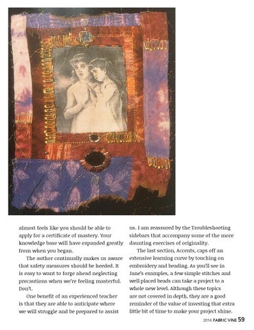 us. I am reassured by the Troubleshooting sidebars that accompany some of the more daunting exercises of originality. The last section, Accents, caps off an extensive learning curve by touching on embroidery and beading. As you’ll see in Jane’s examples, a few simple stitches and well placed beads can take a project to a whole new level. Although these topics are not covered in depth, they are a good reminder of the value of investing that extra little bit of time to make your project shine. 2014 fabric vine 59