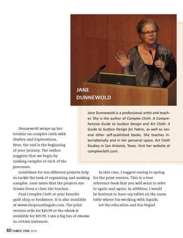 JaNE DUNNEWOLD Jane Dunnewold is a professional artist and teacher. She is the author of Complex Cloth: A Comprehensive Guide to Surface Design and Art Cloth: A Guide to Surface Design for Fabric, as well as several other self-published books. She teaches internationally and in her personal space, Art Cloth Studios in San Antonio, Texas. Visit her website at complexcloth.com.