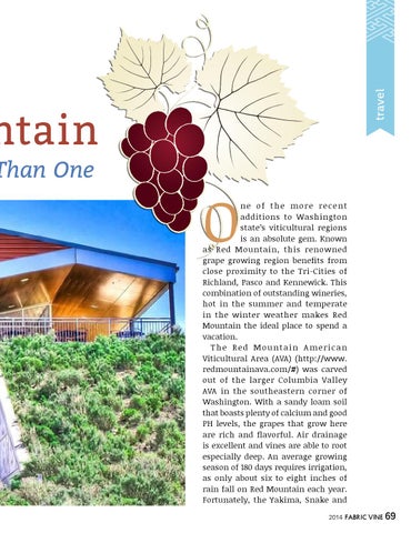 ne of the more recent additions to Washington state’s viticultural regions is an absolute gem. Known as Red Mountain, this renowned grape growing region benefits from close proximity to the Tri-Cities of Richland, Pasco and Kennewick. This combination of outstanding wineries, hot in the summer and temperate in the winter weather makes Red Mountain the ideal place to spend a vacation. The Red Mountain American Viticultural Area (AVA) (http://www. redmountainava.com/#) was carved out of the larger Columbia Valley AVA in the southeastern corner of Washington. With a sandy loam soil that boasts plenty of calcium and good PH levels, the grapes that grow here are rich and flavorful. Air drainage is excellent and vines are able to root especially deep. An average growing season of 180 days requires irrigation, as only about six to eight inches of rain fall on Red Mountain each year. Fortunately, the Yakima, Snake and 2014 FABRIC VINE 69