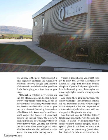 There’s a good chance you might even get to meet Neil Cooper, affectionately known as Coop. He’s the man behind the plan. If you’re lucky enough to find him in the tasting room, he can give you amazing insights into the vintages you’re enjoying. Ask about their 2012 Carmenere. The oldest planting of the Carmenere varietal on Red Mountain is part of the Cooper Estate Vineyard. All of the Cooper wines are consistently delicious and will not disappoint. The plan is working. Last but not least is Fidelitas (http:// fidelitaswines.com). Fidelitas and it’s down-to-earth winemaker/owner extraordinaire, Charlie Hoppes, holds a special place in the heart of Kona Bay. We’ll get to the reason why (see sidebar) but first—let’s talk wine. Launched in