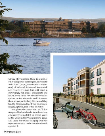 winery after another, there is a host of other things to do in the region. The nearby ‘Tri-Cities’ (http://www.visittri-cities. com) of Richland, Pasco and Kennewick are relatively small but still boast a surprisingly rich mix of restaurants and hotels. You’ll find a few bed and breakfast options on Red Mountain itself. However, these are not particularly diverse, and they tend to fill up quickly. If you want more lodging options, look to the Tri-Cities. Throughout the three cities, you’ll find recognizable chain hotels. Some have been extensively remodeled in recent years as the wine industry continues to grow, and there are options ranging from the super economical to the luxuriously well appointed.