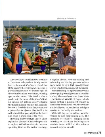 a popular choice. Pleasure boating and swimming are relaxing pursuits. Others might want to try a high speed jet boat tour or windsurfing on one of the rivers. Anyone looking for a pastime that won’t involve getting wet might want to consider birding. The area boasts no fewer than eight National Wildlife Refuges, which makes birding a guaranteed winner in the success department. Plus, the weather is mild all year, so people can indulge a passion for the hobby at any time. With 300 days of sunshine, we’d be remiss by not mentioning golf. The selection of courses—ranging from relaxing to character building—are notable. Most will find the value a pleasant surprise as well. 2014 FABRIC VINE 75