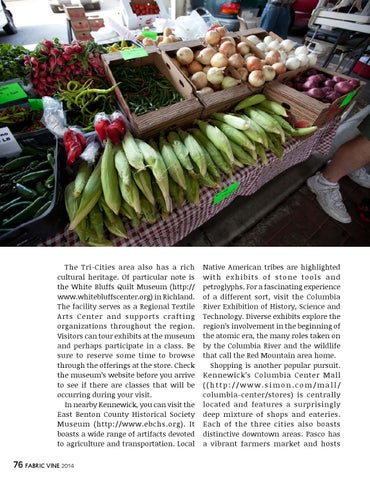 The Tri-Cities area also has a rich cultural heritage. Of particular note is the White Bluffs Quilt Museum (http:// www.whitebluffscenter.org) in Richland. The facility serves as a Regional Textile Arts Center and supports crafting organizations throughout the region. Visitors can tour exhibits at the museum and perhaps participate in a class. Be sure to reserve some time to browse through the offerings at the store. Check the museum’s website before you arrive to see if there are classes that will be occurring during your visit. In nearby Kennewick, you can visit the East Benton County Historical Society Museum (http://www.ebchs.org). It boasts a wide range of artifacts devoted to agriculture and transportation. Local