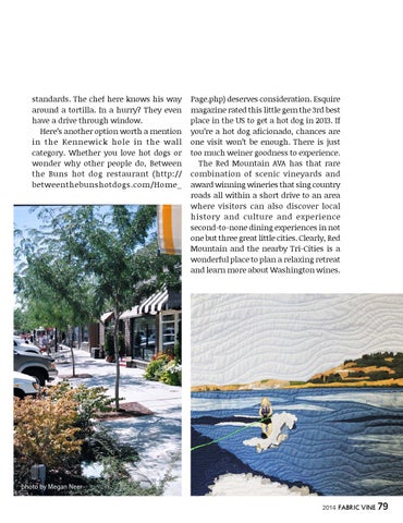 standards. The chef here knows his way around a tortilla. In a hurry? They even have a drive through window. Here’s another option worth a mention in the Kennewick hole in the wall category. Whether you love hot dogs or wonder why other people do, Between the Buns hot dog restaurant (http:// betweenthebunshotdogs.com/Home_