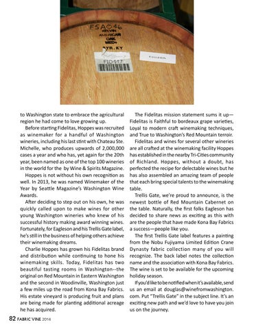 to Washington state to embrace the agricultural region he had come to love growing up. Before starting Fidelitas, Hoppes was recruited as winemaker for a handful of Washington wineries, including his last stint with Chateau Ste. Michelle, who produces upwards of 2,000,000 cases a year and who has, yet again for the 20th year, been named as one of the top 100 wineries in the world for the by Wine & Spirits Magazine. Hoppes is not without his own recognition as well. In 2013, he was named Winemaker of the Year by Seattle Magazine’s Washington Wine Awards. After deciding to step out on his own, he was quickly called upon to make wines for other young Washington wineries who knew of his successful history making award winning wines. Fortunately, for Eagleson and his Trellis Gate label, he’s still in the business of helping others achieve their winemaking dreams. Charlie Hoppes has grown his Fidelitas brand and distribution while continuing to hone his winemaking skills. Today, Fidelitas has two beautiful tasting rooms in Washington--the original on Red Mountain in Eastern Washington and the second in Woodinville, Washington just a few miles up the road from Kona Bay Fabrics. His estate vineyard is producing fruit and plans are being made for planting additional acreage he has acquired.