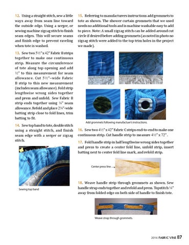 18. Weave handle strip through grommets as shown. Sew handle strap ends together and refold and press. Topstitch 8” away from folded edge on both side of handle to finish tote.