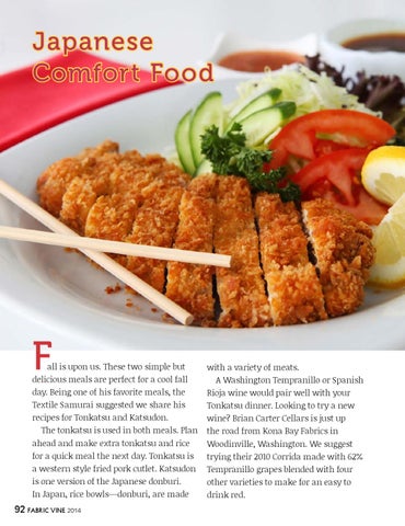 with a variety of meats. A Washington Tempranillo or Spanish Rioja wine would pair well with your Tonkatsu dinner. Looking to try a new wine? Brian Carter Cellars is just up the road from Kona Bay Fabrics in Woodinville, Washington. We suggest trying their 2010 Corrida made with 62% Tempranillo grapes blended with four other varieties to make for an easy to drink red.