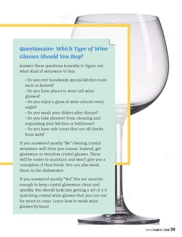 Questionaire: Which Type of Wine Glasses Should You Buy? Answer these questions honestly to figure out what kind of stemware to buy. • Do you ever handwash special kitchen tools such as knives? • Do you have places to store tall wine glasses? • Do you enjoy a glass of wine almost every night? • Do you wash your dishes after dinner? • Do you take pleasure from cleaning and organizing your kitchen or bathroom? • Do you have safe areas that are off-limits from kids? If you answered mostly “No” Owning crystal stemware will drive you insane. Instead, get glassware or stemless crystal glasses. These will be easier to maintain and won’t give you a conniption if they break. You can also wash them in the dishwasher. If you answered mostly “Yes” You are neurotic enough to keep crystal glassware clean and sparkly. You should look into getting a set of 4-6 matching crystal wine glasses that you can use for years to come. Learn how to wash wine glasses by hand