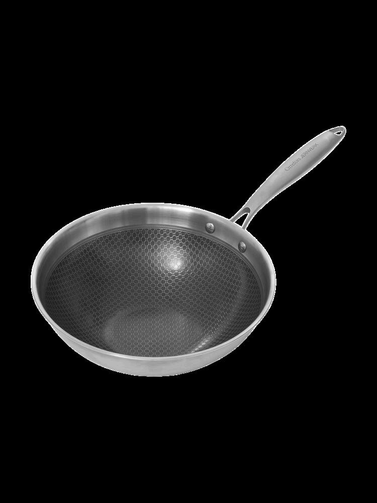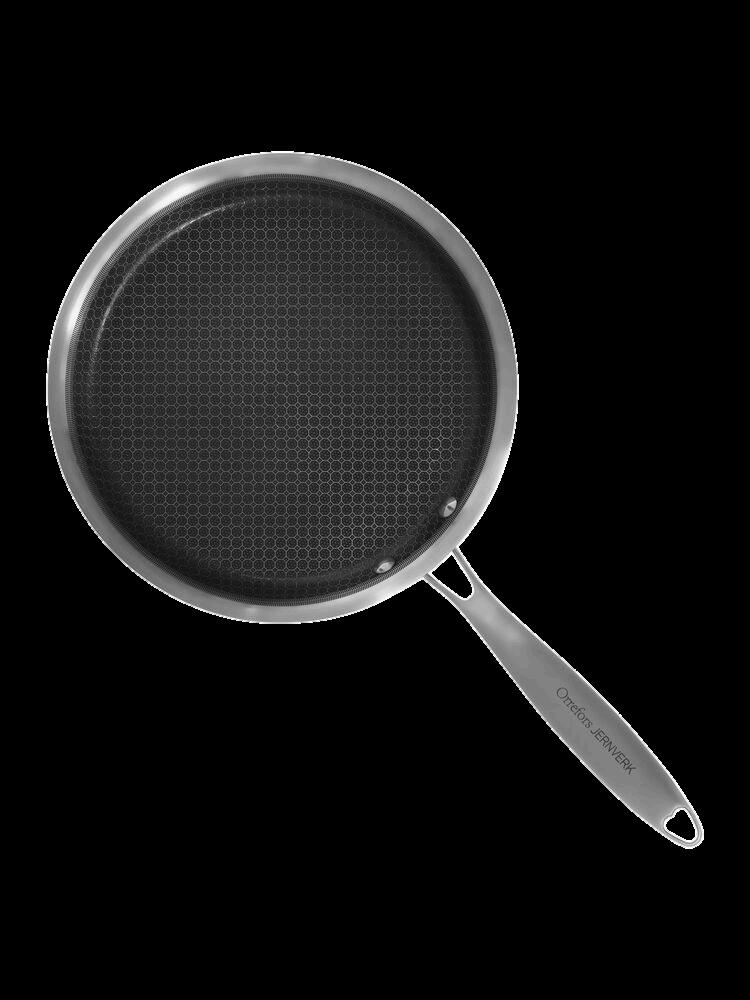 Smidig pizzapanna tillverkad i rostfritt stål med keramisk non-stick-botten Pannan klarar höga temperaturer, fördelar värmen jämnt och passar utmärkt för stekning både av pizza och pannkakor.
