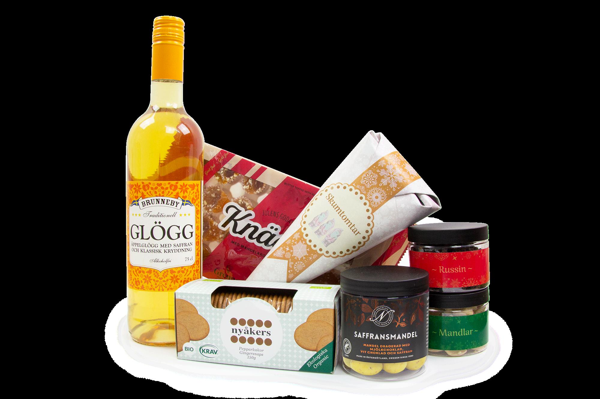 Högtidligt glöggkit Finns i utförande; cellofanpåse, tygbag eller trälåda Går även att få egen etikett på glöggen.