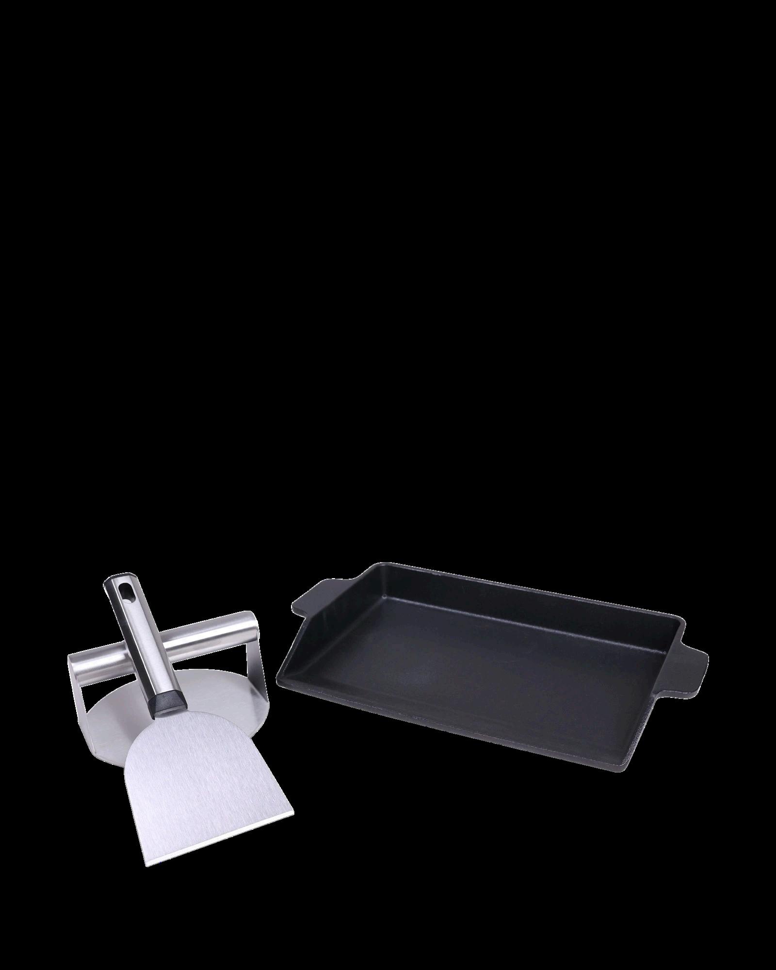 Gjutjärnsbricka med smashburger-kit som ger jämn värme och rejäl stekyta Den rostfria pressen ger jämnt tryck för burgare och annat som kräver yta och snabb tillagning Fungerar på spishäll, utekök och öppen låga