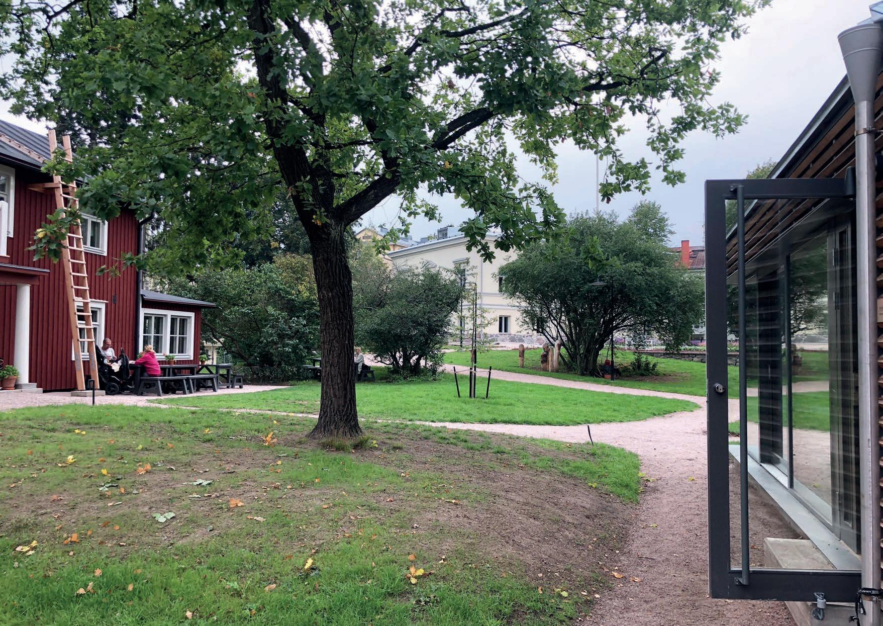 Näkymä kartanolle Punaisen huvilan ja piharakennuksen välistä,TALLI 2018.