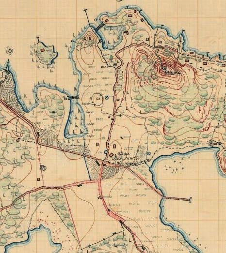 kartano tykistöpatterien ja ruutivarastojen sijaintia kuvaavalla kartalla vuodelta 1893. VeSA linnoitus- ja rakennuspiirustukset; MTM. Lauttasaari. Asemakartta. KA.