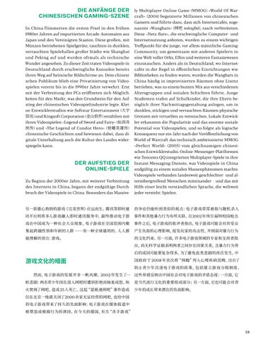 lands »spielen« außer Schiller eigentlich nur Kinder, das chinesische »玩« wird hier in der Regel mit »amüsieren« übersetzt – und in China sehr viel freier verstanden. In China wird jegliche Freizeitaktivität »gespielt« (出去玩儿 chūqù wánr). Dazu kommen der Sport, Gesellschafts-, Brett- und Kartenspiele, klassische Rollenspiele bis hoch technisierte Computerspiele, der Aktien markt und vieles mehr. Es betrif t Themen von Technologie und Wirtschaft, Kultur und Gesellschaft bis hin zur Psychologie. Wir legen den Fokus insbesondere auf Videospiele, aber auch auf den professionalisierten E- Sport, der inzwischen als of zielle Sportart anerkannt ist und im Wettbewerb für die Olympischen Spiele steht.