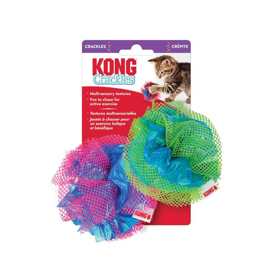KONG® Crackles Fluff Balls captivate cats with crinkly, textured fun, sparking their natural curiosity and instincts. The multisensory design creates engaging crackling sounds that entice playful swatting, batting, and pouncing. These oversized, ultra-light balls are perfect for full-body grabbing, biting, and chasing—so lightweight that they effortlessly soar through the air and race across the room with every playful swipe. For added excitement, tuck a sprinkle or spritz of catnip into the folds to heighten engagement. Designed for cats of all ages and activity levels, these toys provide endless entertainment!