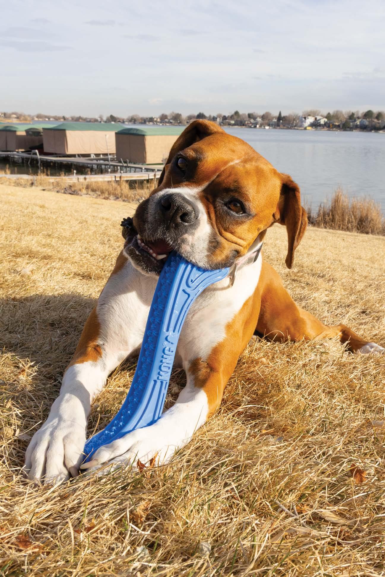 KONG® CoreStrength taps into dogs’ chewing instincts with its irresistible texture, featuring an array of nubs and grooves to encourage healthy chewing behaviors while supporting clean teeth and gums. Designed with a solid CoreTec™ bamboo blend core for durability, KONG CoreStrength withstands countless hours of play for long-lasting chewing and fetching fun!