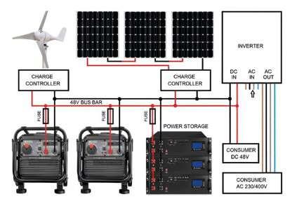 Integracja z zieloną energią (systemy solarne, wiatrowe elektrownie) — generatory prądu stałego (24–54 V) lub generatory z wbudowanym systemem ATS można podłączyć do kontrolera inwertera słonecznego w celu automatycznego ładowania akumulatorów zasilania domu energią elektryczną.