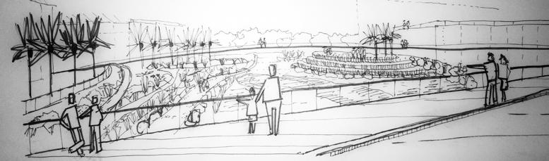 Inspired by downstream riverbeds the water gardens consist of a series of islands with water flowing during the wetter season. Calibration of water levels to be further developed in next stages. Some ponds may be permanent water features, whilst the surrounding linear Riverine Landscape could, during drier seasons be transformed into an experience where people could be invited to engage with the water garden and walk through the base of a gravel riverbed to experience the Riverine landscape from a sunken perspective.