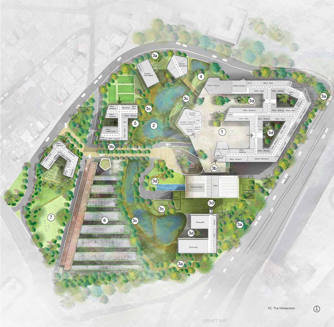 Tree clusters associated with areas around the buildings create distinct mini forests to provide shade and cooling for staff and visitors. Integration with the proposed canopy and dinning terrace to complement the adjacent activities will help to create different atmospheres within the campus. Courtyard spaces associated with work functions may be designed with collaboration spaces. The