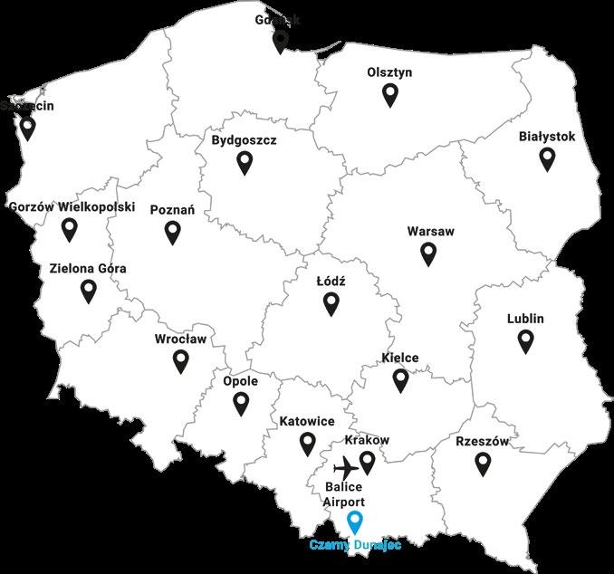 Krynica-Zdrój Uście Gorlickie DISTANCE BETWEEN CZARNY DUNAJEC AND OTHER VOIVODESHIP CITIES CITY TIME DISTANCE Białystok Bydgoszcz Gdańsk Gorzów Wielkopolski Katowice Kielce Krakow Lublin Łódź Olsztyn Opole Poznań Rzeszów Szczecin Warsaw Wrocław Zielona Góra 590 km 565 km 680 km 628 km 163 km 220 km 95 km 421 km 362 km 607 km 272 km 542 km 247 km 730 km 397 km 354 km 524 km 6 h 50 min 6 h 30 min 7 h 20 min 6 h 50 min 2 h 20 min 3 h 20 min 1 h 40 min 4 h 50 min 4 h 40 min 7 h 40 min 3 h 30 min 6 h 10 min 2 h 50 min 7h 50 min 5 h 10 min 4 h 10 min 5 h 50 min