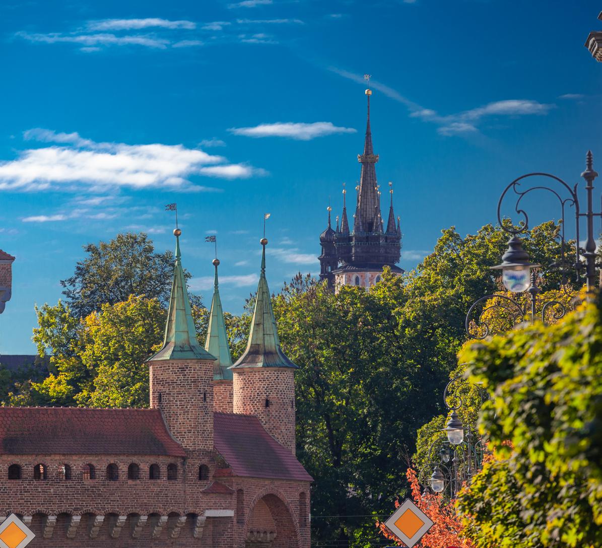 Rozpoczynając nasze zwiedzanie, zmierzamy w kierunku Barbakanu, miejsca, gdzie goście przyjeżdżający do miasta byli rozbrajani. Setki lat temu Barbakan, był integralną częścią pięknej Bramy Floriańskiej, był połączony z nią mostem zwanym szyją. Bramę wraz z trzema basztami chciano rozebrać razem z pozostałymi murami miejskimi, ale obronił je Feliks Radwański. To dzięki niemu, na ulicę Floriańską wchodzimy przez to zabytkowe miejsce. Trakt dalej prowadzi słynną Floriańską, przy której zobaczymy m.in. Jamę Michalika (to tam działał znany kabaret Zielony Balonik) oraz Dom Jana Matejki. Z ulicy Floriańskiej trakt prowadzi na Rynek, przechodzimy koło Kościoła Mariackiego, z którego wieży o każdej pełnej godzinie usłyszymy Hejnał Mariacki. Tam też znajduje się piękny Ołtarz Wita Stwosza. Przechodzimy obok Pomnika Adama Mickiewicza, Sukiennic i kościółka św. Wojciecha, gdzie słynny męczennik miał głosić swoje kazania.