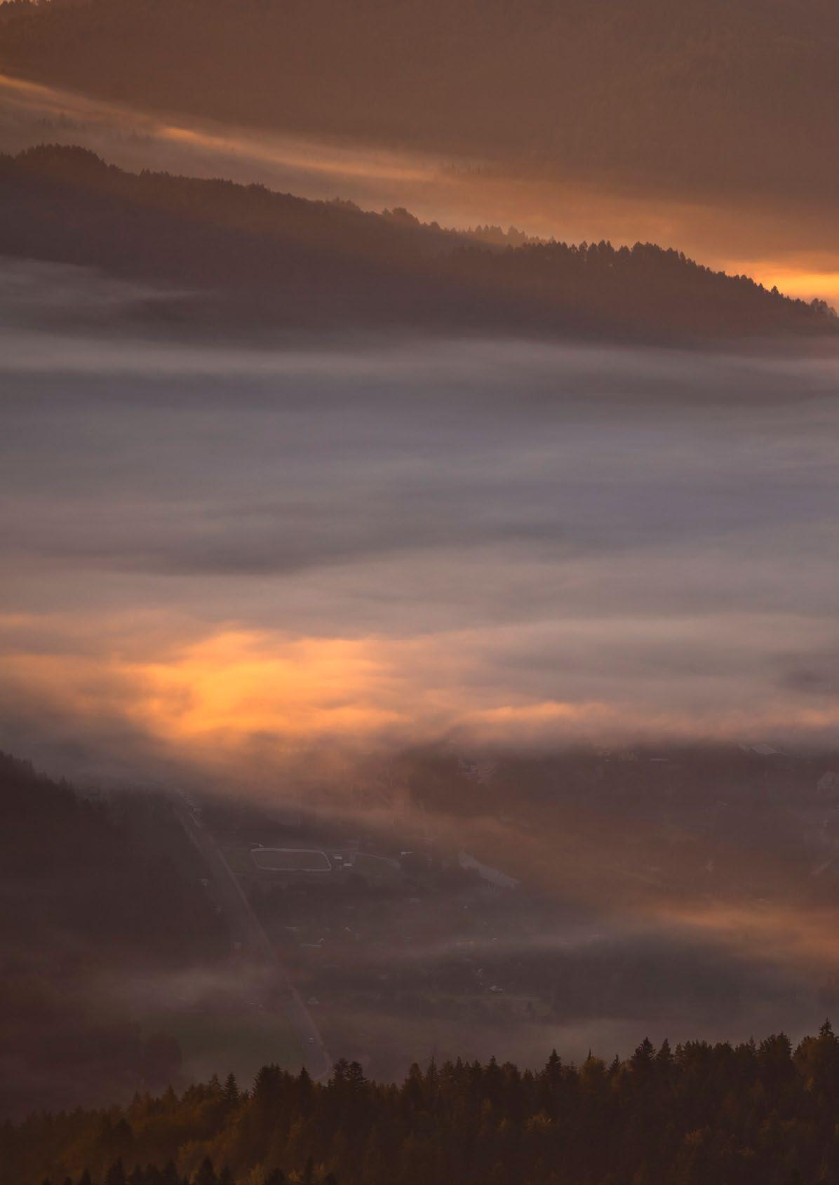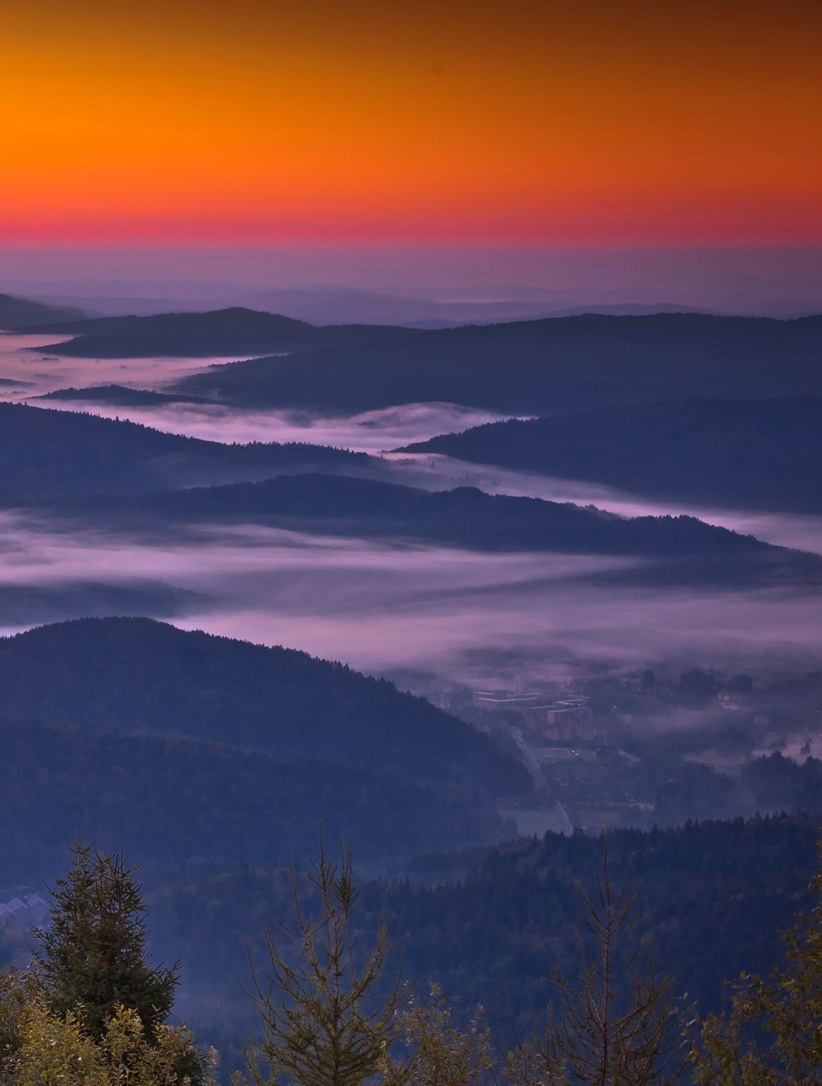 Morze mgiel otulające Krynicę-Zdrój o brzasku z Jaworzyny Krynickiej