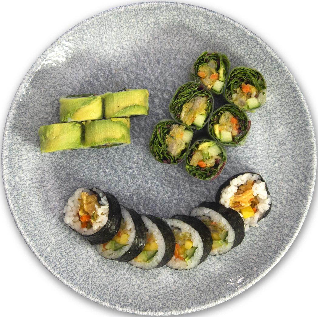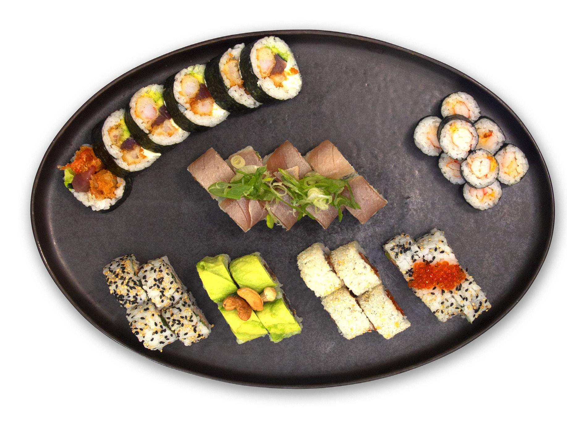 sumo kingfish, avocado, agurk, basilikum, tobikorogn, wasabimayo, soyapapir 8 stk 149,-
