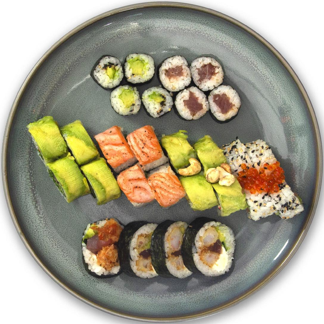 ottawa grillet laks, agurk, kimchee gulrot, sesam, spicysauce, teriyakisauce, toppet m avocado 8 stk 149,-