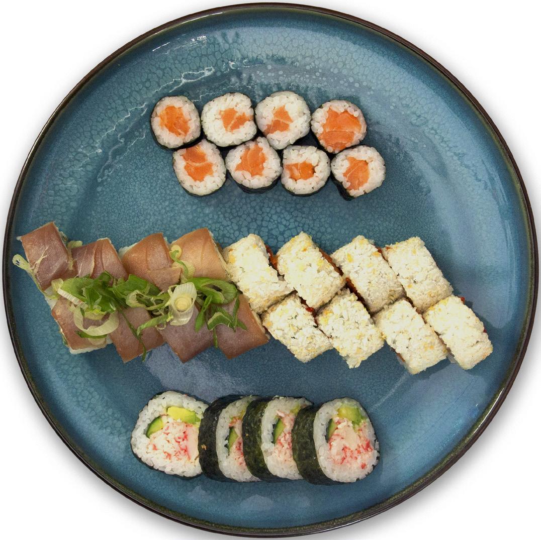lekker laks rucola, agurk, nykvernet pepper, sjalottløk, soyamayo, toppet m flammegrillet laks 8 stk 149,-