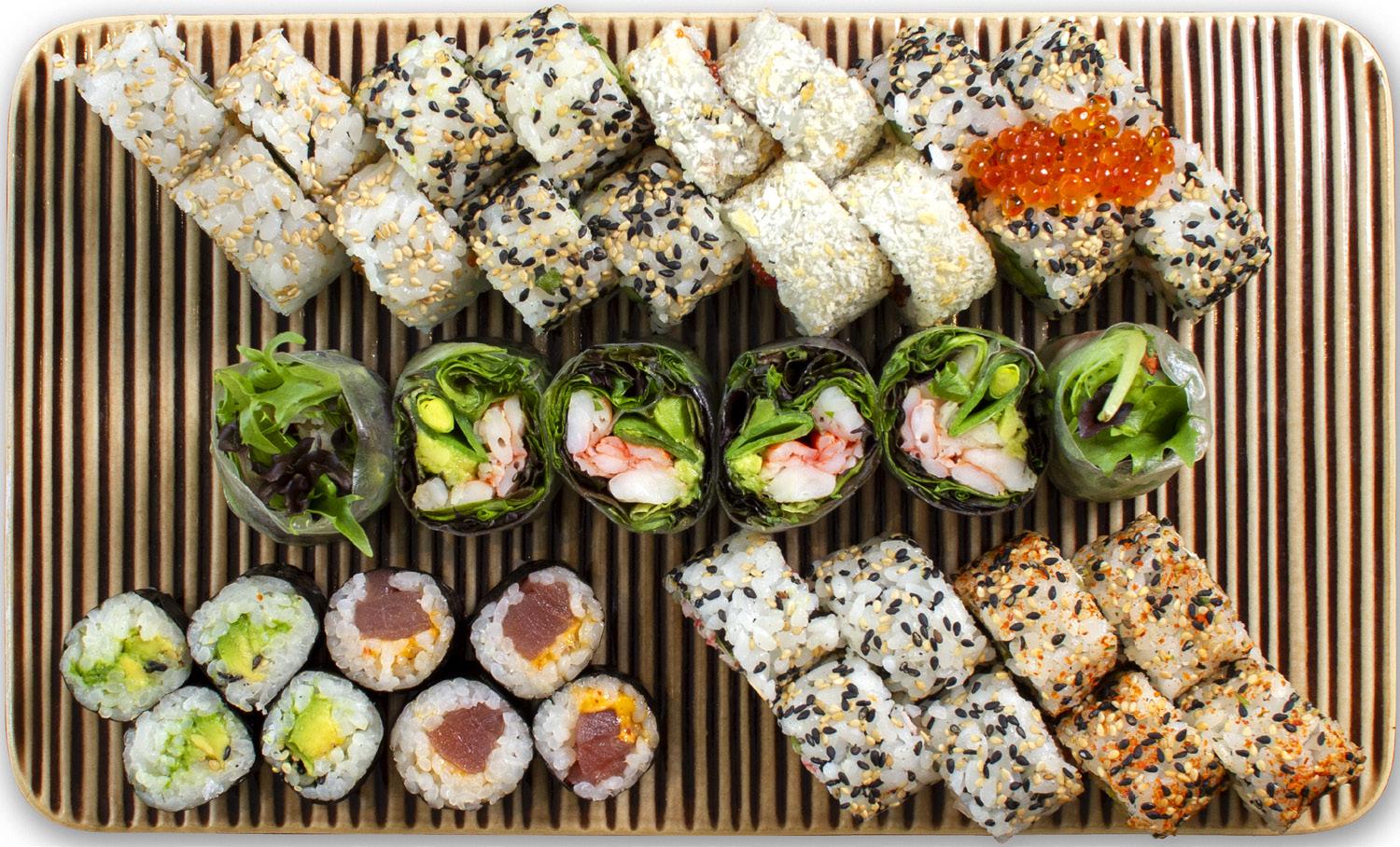 rainbow – også kalt kaburimaki – toppes med fisk og grønt, for å matche innholdet i rullen perfekt