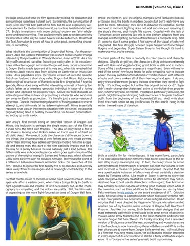 KONSHUU | Volume 56, Issue 4 the large amount of time the film spends developing his character and surroundings is perhaps its best part. Surprisingly, the canonization of Broly is not only the best part of his film, but it’s also a genuinely welcome element for the franchise’s world, as much as I wish it ended with GT. Broly’s interactions with more civilized society are fairly wholesome and heartwarming. The audience really gets to understand why the character is the way he is and how he can be redeemed. It’s almost like Toei Animation is aware of how to write good, compelling characters, or something. What I dislike is the canonization of Dragon Ball Minus. For those unaware, Jaco the Galactic Patrolman was a short twelve chapter manga released by Toriyama Akira in Weekly Shounen Jump in 2012. As a fun, fairly self-contained narrative featuring a wacky alien in his misadventures with a teenage girl and misanthropic old man, Jaco’s connection to Dragon Ball is made apparent at its very end, when it is revealed that the threat Jaco was to stop from arriving on Earth was an infant Son Goku. As a paperback extra, the volume version of Jaco the Galactic Patrolman featured a short story called Dragon Ball Minus. Retconning Toei’s original incarnation of Bardock in the first Dragon Ball Z special episode, Minus does away with the interesting contrast of having Son Goku’s father as a heartless genocidal individual in favor of a loving person who opposed his people’s ways. Minus’ Bardock discards an interesting narrative in favor of presenting a character who sends his son away to Earth as protection. It’s literally just a worse version of Superman. Gone is the interesting dynamic of having a mass murderer attempt to, and ultimately fail in, redeeming himself. Minus essentially replaces what was an interesting situation with the series’ protagonist originally being fated to destroy the world but, via his own circumstances, ending up as its savior. With Broly’s first stretch being an extended version of Dragon Ball Minus, this inclusion is perhaps the single worst part of the film as it even ruins the film’s own themes. The idea of Broly being a foil to Son Goku is lacking when Goku’s arrival on Earth was in of itself an altruistic deed. Moreover, it boils the characters’ differences down to two things: the circumstances of their fathers and their innate powers. Rather than showing how Goku’s adventures molded him into a capable and strong man, this part of the film basically implies that he is the way he is purely because he was naturally just a kind person. His father really was an honorable person, which goes against much of the pathos of the original manga’s Saiyan and Frieza arcs, which showed Goku come to terms with his troubled heritage. It removes the world of a difference between a Kakarot and a Son Goku. On rewatches of this film, I choose to ignore the first twenty-five or so minutes as it actively takes away from its messages and is downright contradictory to the series as a whole. For that matter, much of the film at some point devolves into an action spectacle after a certain point, when Frieza brings Broly to Earth to fight against Goku and Vegeta. It isn’t necessarily bad, as the choreography is compelling and the colors are pretty. Still, the film reeks of appealing to the more fight-focused portions of Dragon Ball fans.