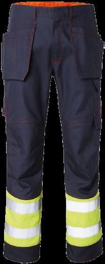 Side- og baklommer. Napoleonslommer med glidelås og pennholder på venstre arm. Forsterkede knelommer. Lårlomme med mobillomme på venstre ben med utvendig mobillomme og pennholdere. Kombinert tommestokklomme og lomme til målebånd på høyre side. Formsydde knær. Gule kontrastdetaljer og tynne refleksbånd. Lukkes i livet med jeansknapp og glidelås. Høy krage og glidelås i front.